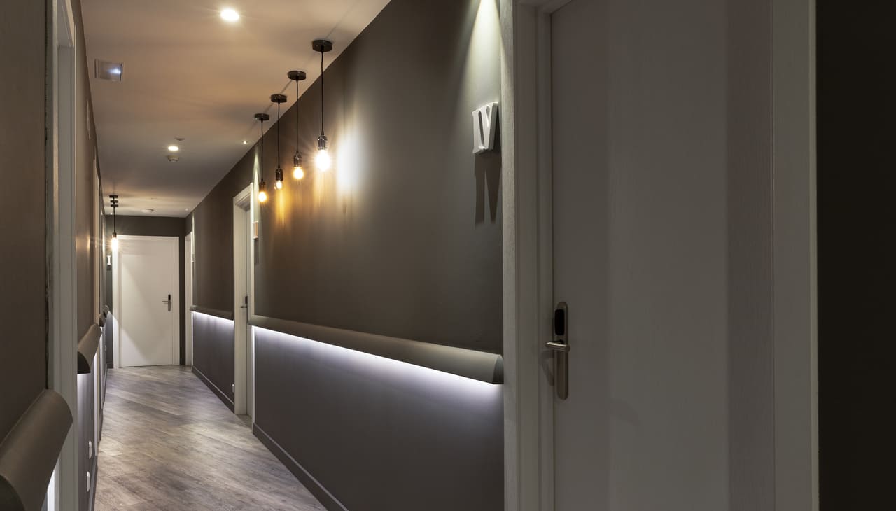 • Споты. С помощью спотов можно подсветить стены узкого коридора и затенить потолок, который будет казаться ниже. Тем самым коридор не будет напоминать глубокий колодец.