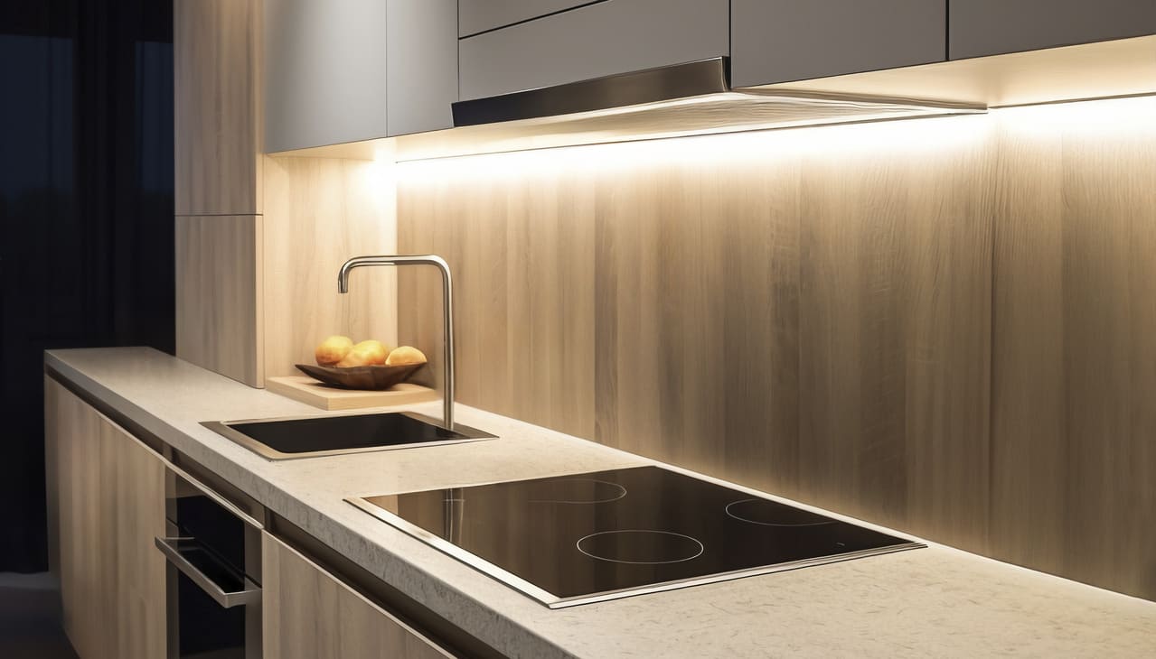 • Светодиодная лента. Светодиодная лента идеально подходит для того, чтобы организовать подсветку рабочей зоны. Это эффектное и практичное решение для помещений с повышенным уровнем влажности и частыми температурными колебаниями. К тому же такая подсветка долговечна, потребляет минимум электроэнергии, стойко переносит скачки напряжения в сети.