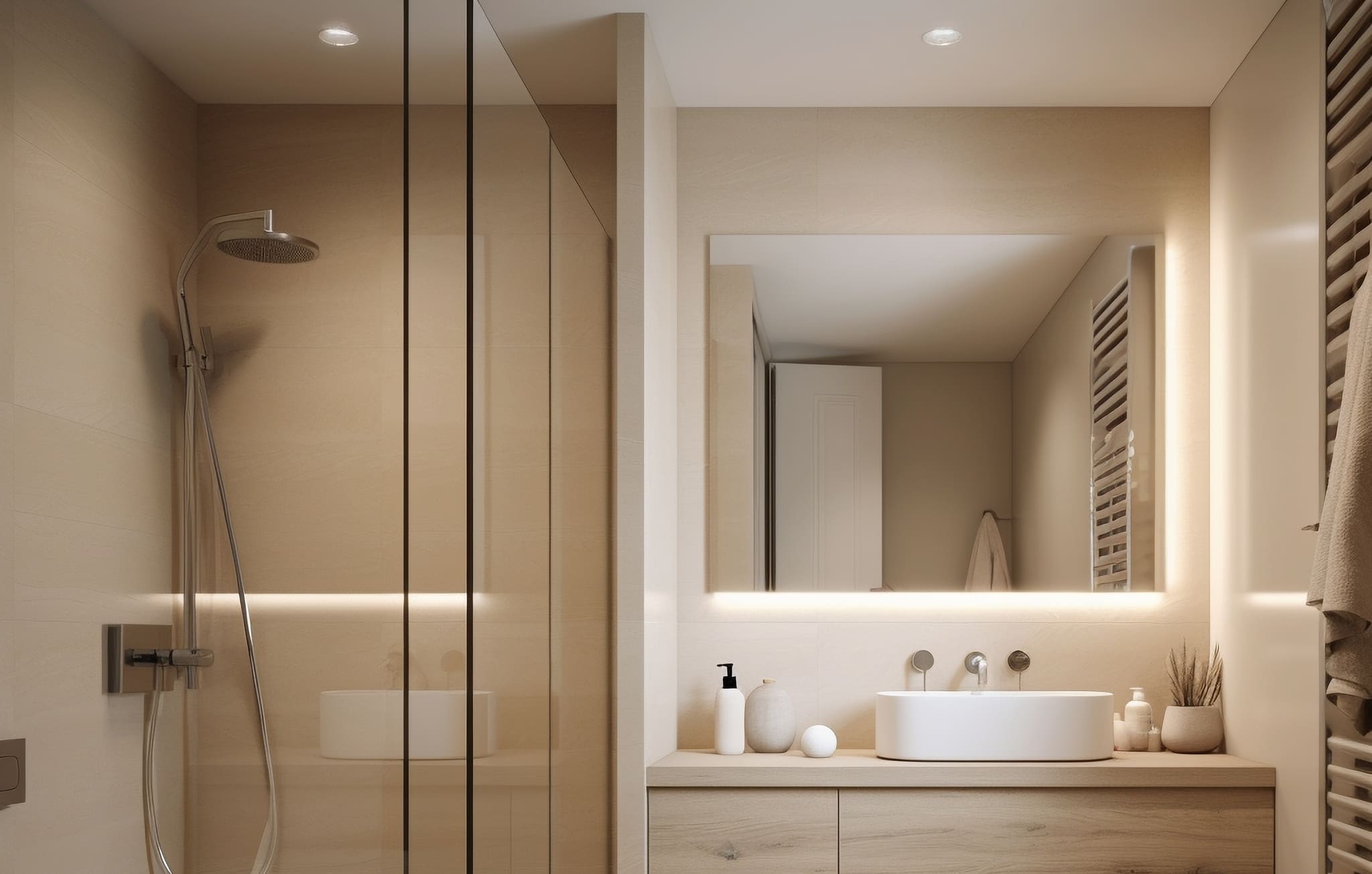 Точечные светильники располагаются по периметру потолка ванной комнаты, обеспечивая ровное распределение света.