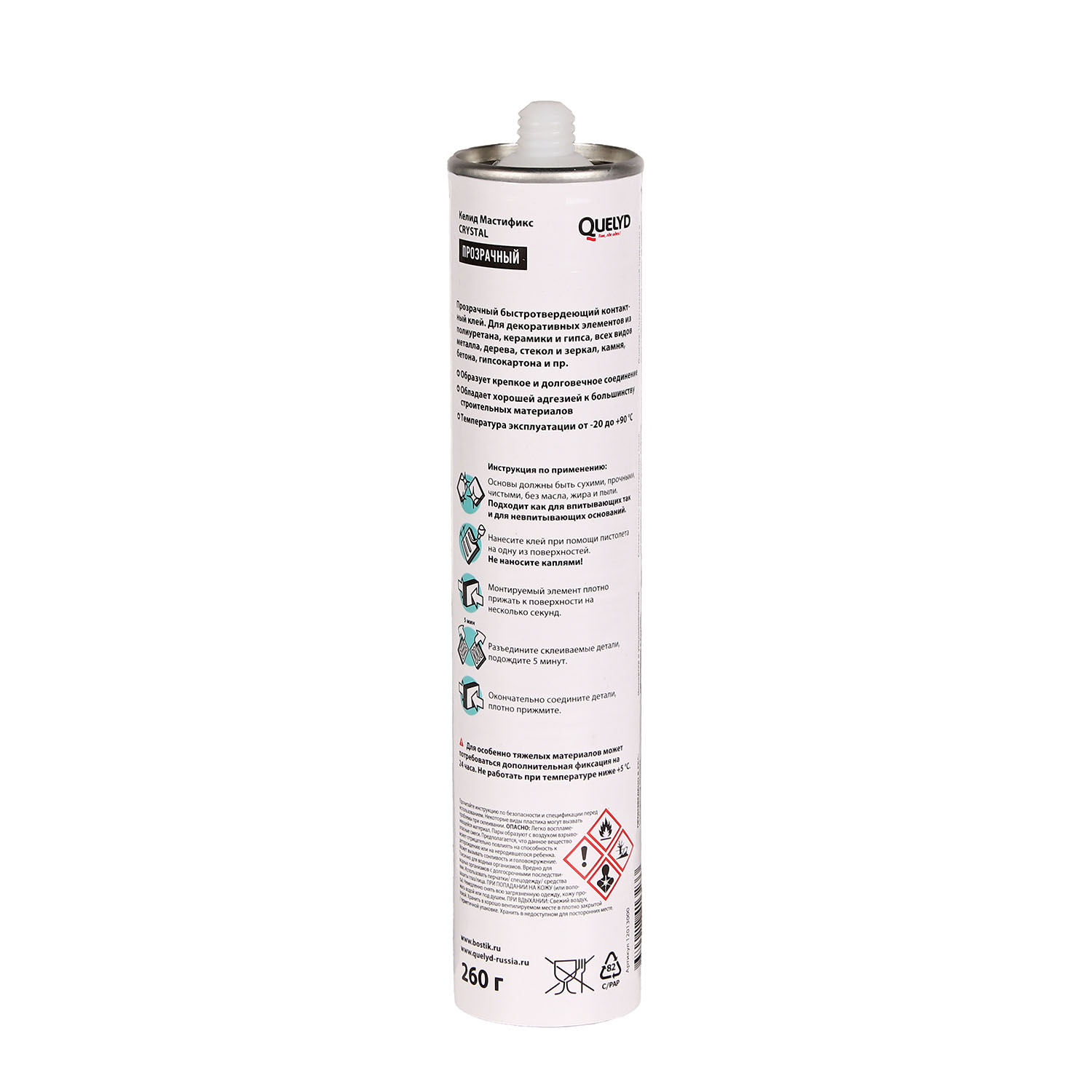 штЖидкие гвозди Quelyd Мастификс CRYSTAL — однокомпонентный клей на основе искусственных смол, высыхающий за счет физического испарения растворителей. Разработан для универсального применения, может заменить большинство монтажных клеев. Создает сверхпрочное клеевое соединение.
