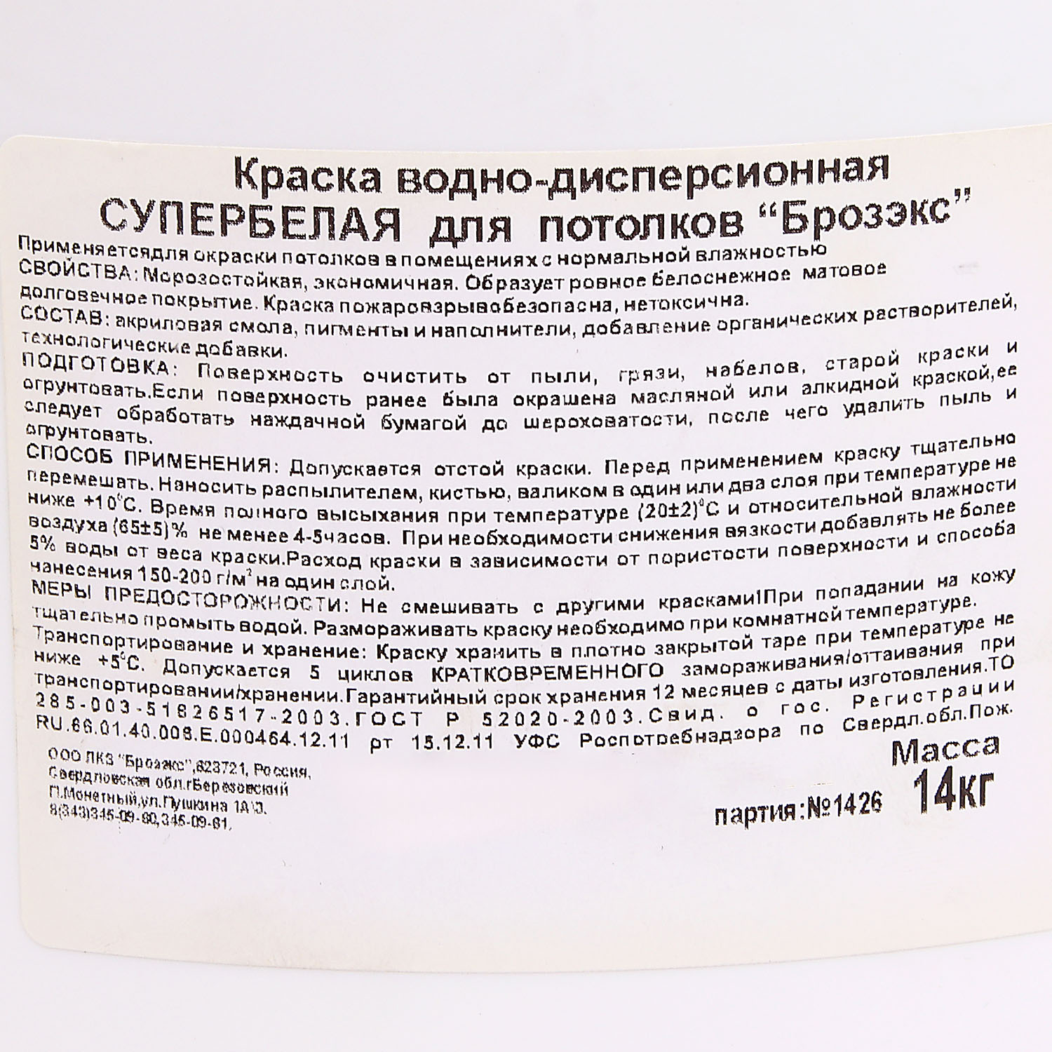 Краска акриловая для потолков 14 кг BROZEX Белоснежная *1/48