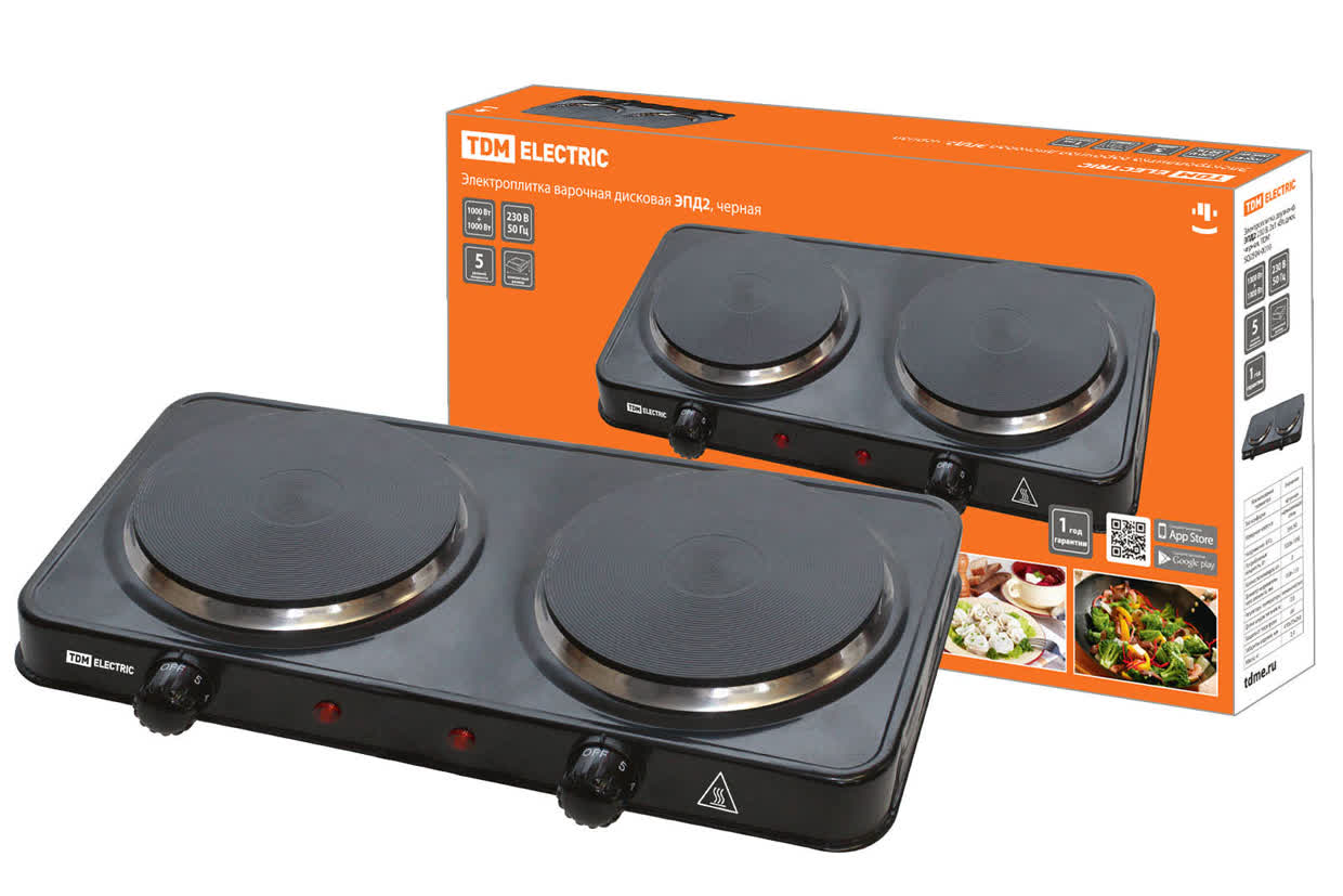 Электроплитка 2 конфорки 2000Вт диск, черная ЭПД2 230В 2х1кВт TDM SQ2504-0010 *1/6