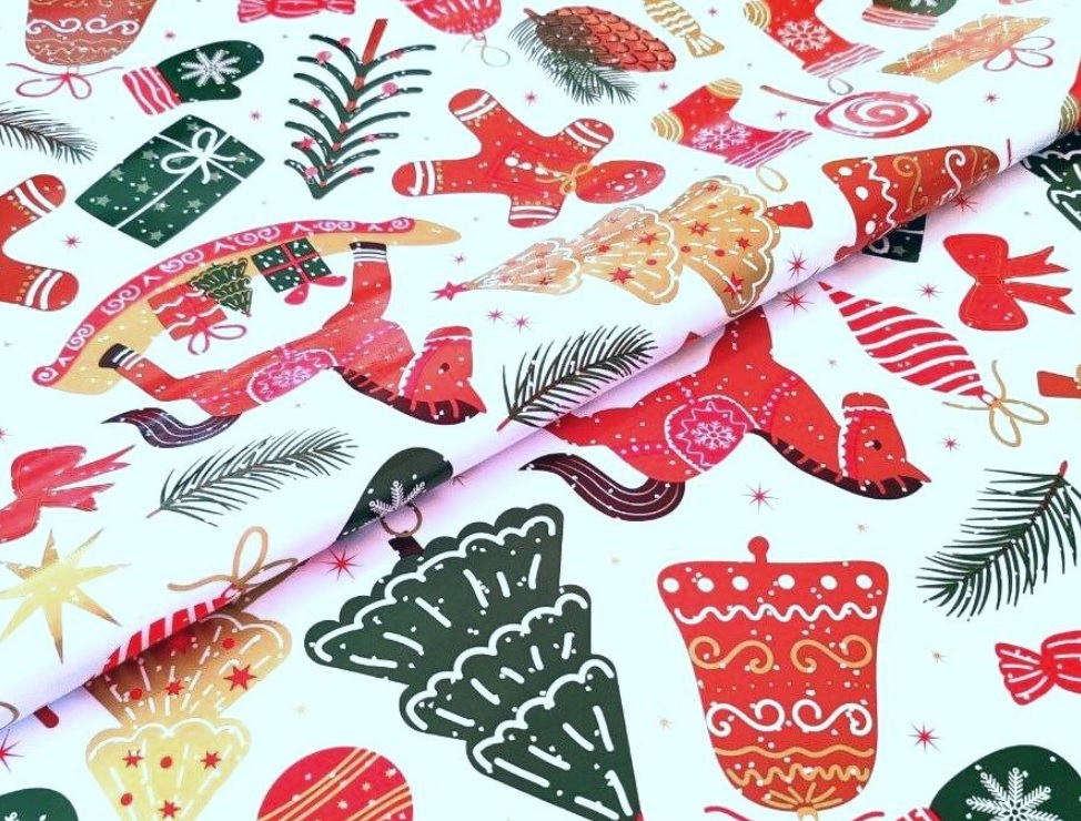 Клеёнка на тканевой основе "Глянец" "Новогодний коллаж" белый фон шир.1,37м GW-21769 "Great Way" *20