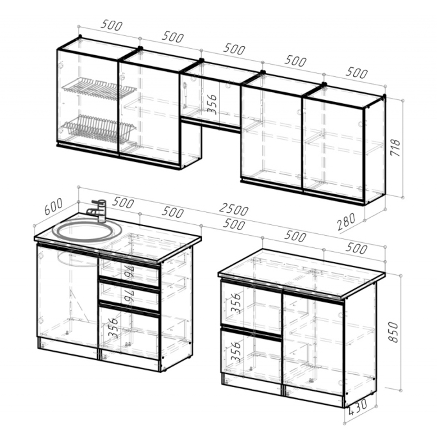 *мойки, смесители и посудосушители в комплекты гарнитуров не входят.