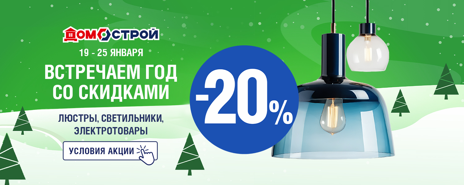 Распродажа в сети ДомоСтрой! С 19 по 25 января — скидка -20% на гр. Освещение и электротовары. Готовитесь к ремонту или мечтаете освежить интерьер? Самое время обновить освещение, заменить электрику и сделать дом комфортнее и безопаснее.