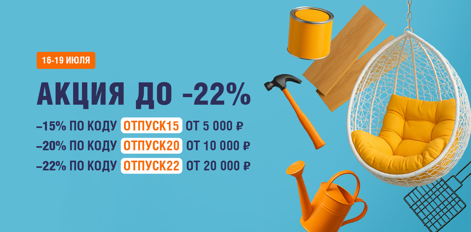 Скидка распространяется только на товары с белыми ценниками и с шильдиком «ОТПУСКНЫЕ», не распространяется на товары с желтыми ценниками, на гр. Строительные материалы и не суммируется с другими акциями (в том числе со скидкой по дисконтной карте, скидкой для пенсионеров и акцией для новоселов). При применении промокода списание бонусов станет недоступным.